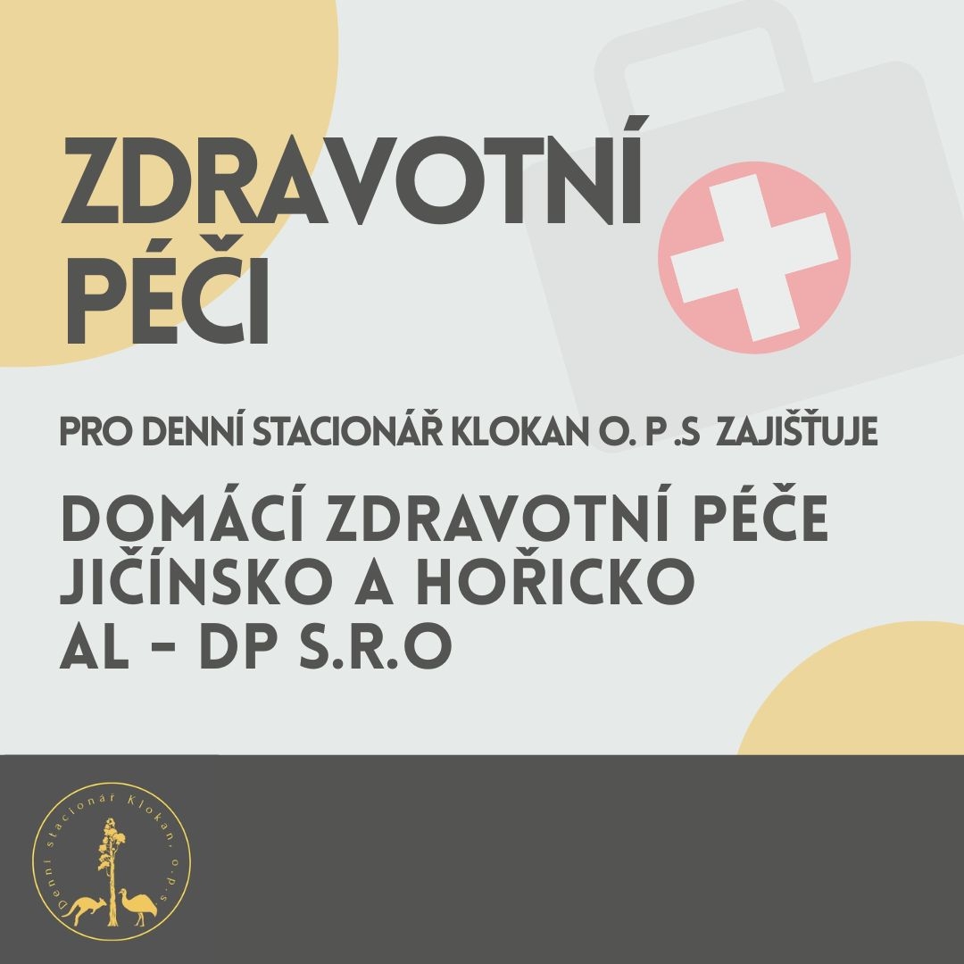 Jelikož naši zaměstnanci denního stacionáře Klokan nemají odborné zdravotnické vzdělání, je poskytování zdravotní péče klientům zajištěno externě prostřednictvím společnosti AL – DP s.r.o., Domácí zdravotní péče pro Jičínsko a Hořicko. Každodenně k nám dojíždějí kvalifikovaní zdravotníci, kteří poskytují potřebnou odbornou péči.